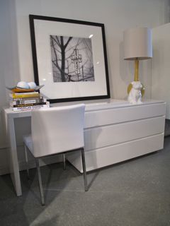 “This sleek, lacquered three-drawer dresser with desk speaks to my love of form and function. The desk piece just rests atop the dresser, so it can be placed in any configuration—pull it out when you need to use it and push it back in when you don’t.”