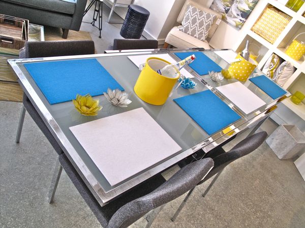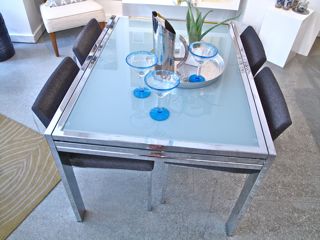 Solving the dilemma of whether to buy a small table or a big table is our Duo Extension Table. With a light pull, tilt and a push, it transitions from a table for four to a table for eight. There’s options galore on this one too. Set with Aria chairs, it’s shown in chrome with frosted glass, but you can have your frame black or white and the glass in black, white, red or orange. Party time, excellent.